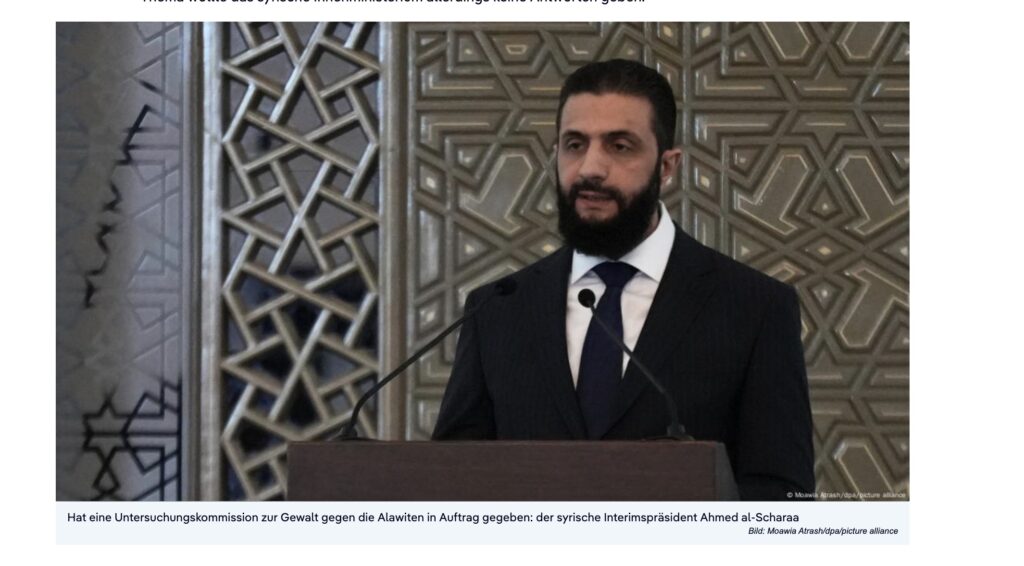 خاصة في الأشهر الأخيرة، يتعرض العلويون في سوريا لضغوط كبيرة ومهددة للحياة في كثير من الأحيان. في مارس، وقعت هجمات دامية ضد العلويين أسفرت عن مقتل مئات الأشخاص. أفادت وسائل إعلام مختلفة أن جزءًا على الأقل من العصابات المسلحة لها صلات بوزارة الداخلية السورية. شكل الرئيس المؤقت أحمد الشريعة لجنة تحقيق. لكن النتائج لم تظهر بعد. لكن الخوف من العنف يتزايد بين الأقليات السورية، بما في ذلك المسيحيون، كما هو الحال بالفعل بالنسبة للعديد من العلويين.