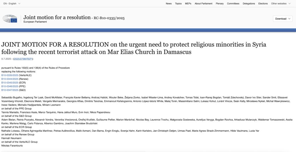 قرار البرلمان الأوروبي بشأن الحاجة الملحة إلى حماية الأقليات الدينية في سوريا في أعقاب الهجوم الإرهابي الأخير على كنيسة مار إلياس في دمشق