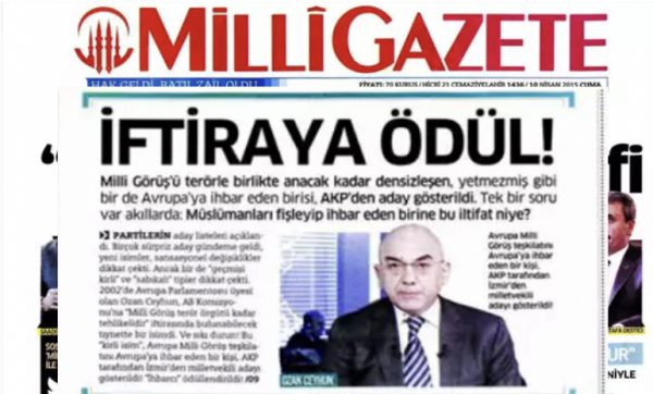 Die Zeitung Milli Gazete von Milli Görüs betitelt Ozan Ceyhun am 10.04.2015 in der gedruckten Zeitung und im Internet (09.04.2015) mit der Überschrift, „Belohnung für Verleumdung!“ als Verleumder.