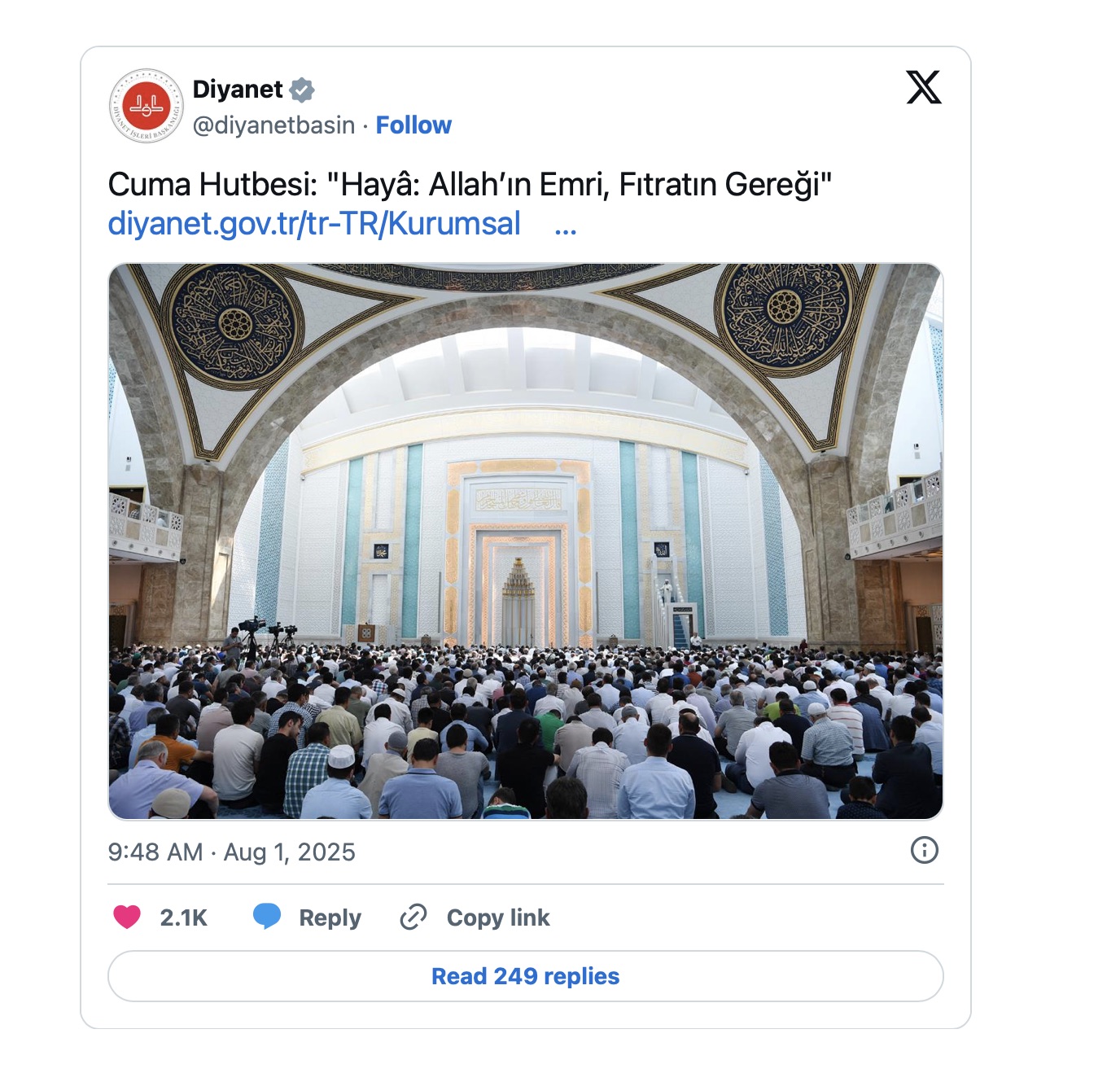 In der am 1. August 2025 ausgestrahlten Diyanet-Predigt im Freitagsgebet in 90.000 Moscheen hieß es unter anderem: „Das Tragen unangemessener Kleidung in öffentlichen Räumen, insbesondere in institutionellen Einrichtungen, verstößt gegen grundlegende moralische Normen.“ Diese Aussage kann als „Vorschrift bzw. Zwang zum Tragen eines Kopftuchs“ interpretiert werden. Das ist nicht modern, sondern primitiv. Wer sich nicht gegen die Verletzung moralischer und sittlicher Normen ausspricht, trägt eine große Verantwortung. Denn es ist unsere gemeinsame Pflicht, die Sittlichkeit, Anständigkeit und Moral unserer Generation zu schützen.“