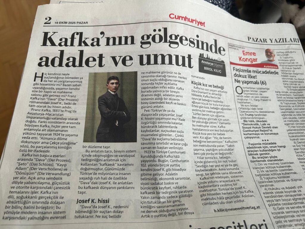 Die traditionsreiche türkische Qualitätszeitung Cumhuriyet („Die Republik“), die älteste noch erscheinende Zeitung der Türkei, veröffentlichte am 19. Oktober 2025 auf Seite zwei in ihrer Rubrik einen Essay von Birol Kılıç aus Wien mit dem Titel „Gerechtigkeit und Hoffnung im Schatten Kafkas“ (Justice and Hope in Kafka’s Shadow), auf Türkisch: „Kafka’nın gölgesinde adalet ve umut“.