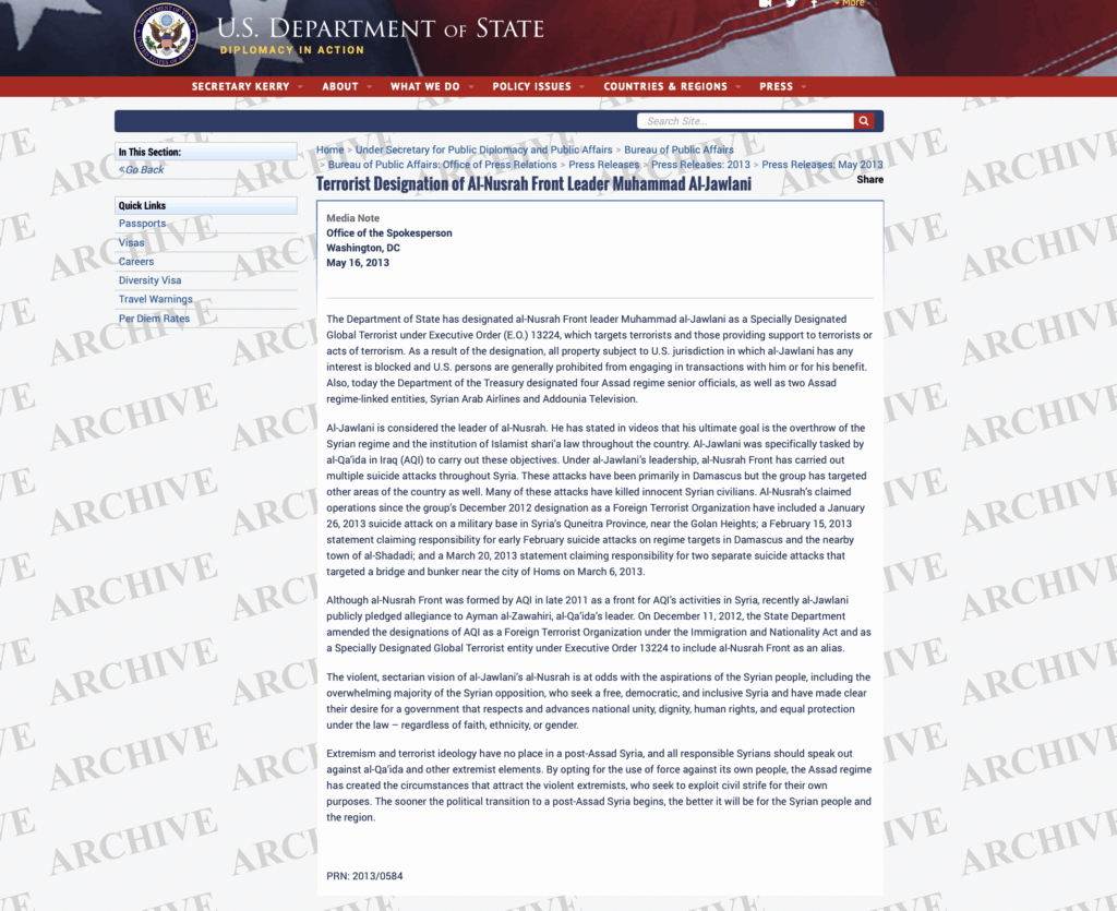 ABD Dışişleri Bakanlığı’nın 30 Mayıs 2013 tarihli resmî açıklamasına göre, Ebu Muhammed el-Culani “Özel Olarak Belirlenmiş Küresel Terörist” (Specially Designated