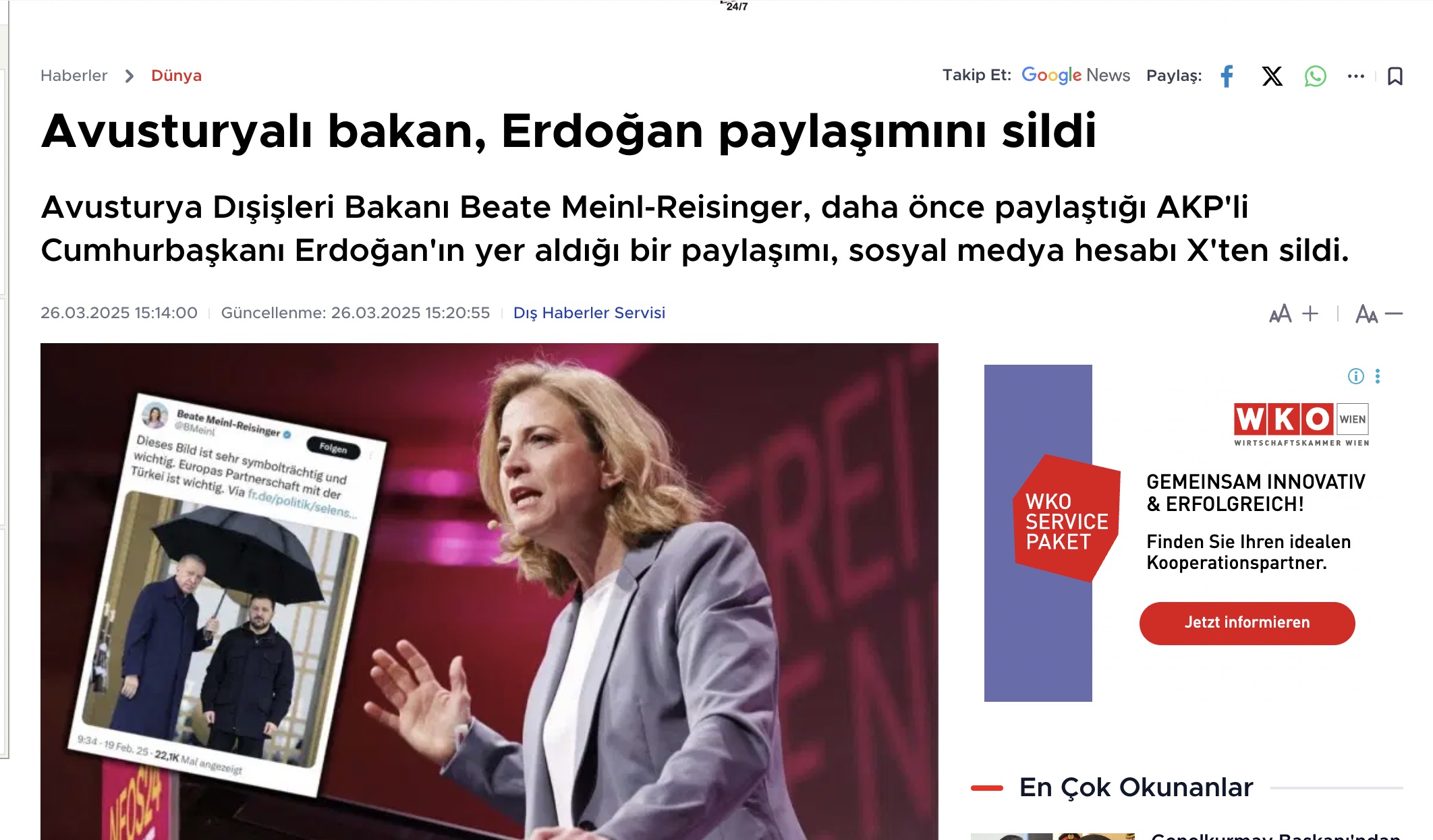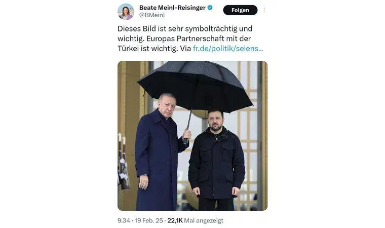 Meinl-Reisinger, der ein Foto von Präsident Erdoğan und Volodimir Zelenski auf seinem Twitter-Account geteilt hatte, entfernte diesen Beitrag. Die Zeitung Cumhuriyet und die regionalen österreichischen türkischen Zeitungen haben darüber berichtet.