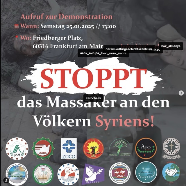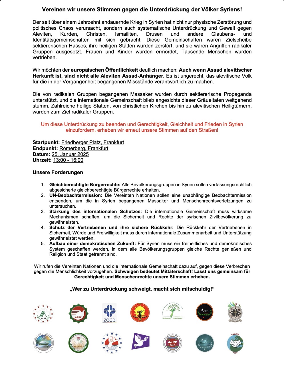 WIEN.14 alevitische zivilgesellschaftliche Organisationen in Frankfurt am Main haben alle Bürgerinnen und Bürger zur Unterstützung und Teilnahme an einem Marsch aufgerufen, der am Samstag, 24. Januar, um 13 Uhr unter dem Motto „Vereint gegen die Verfolgung und Tyrannei des syrischen Volkes“ beginnt: „Wir fordern die Vereinten Nationen und die internationale Gemeinschaft auf, gegen diese Verbrechen gegen die Menschlichkeit vorzugehen. Schweigen ist Mittäterschaft! Erheben wir gemeinsam unsere Stimme für Gerechtigkeit und Menschenrechte, denn wer zur Unterdrückung schweigt, macht sich mitschuldig!“