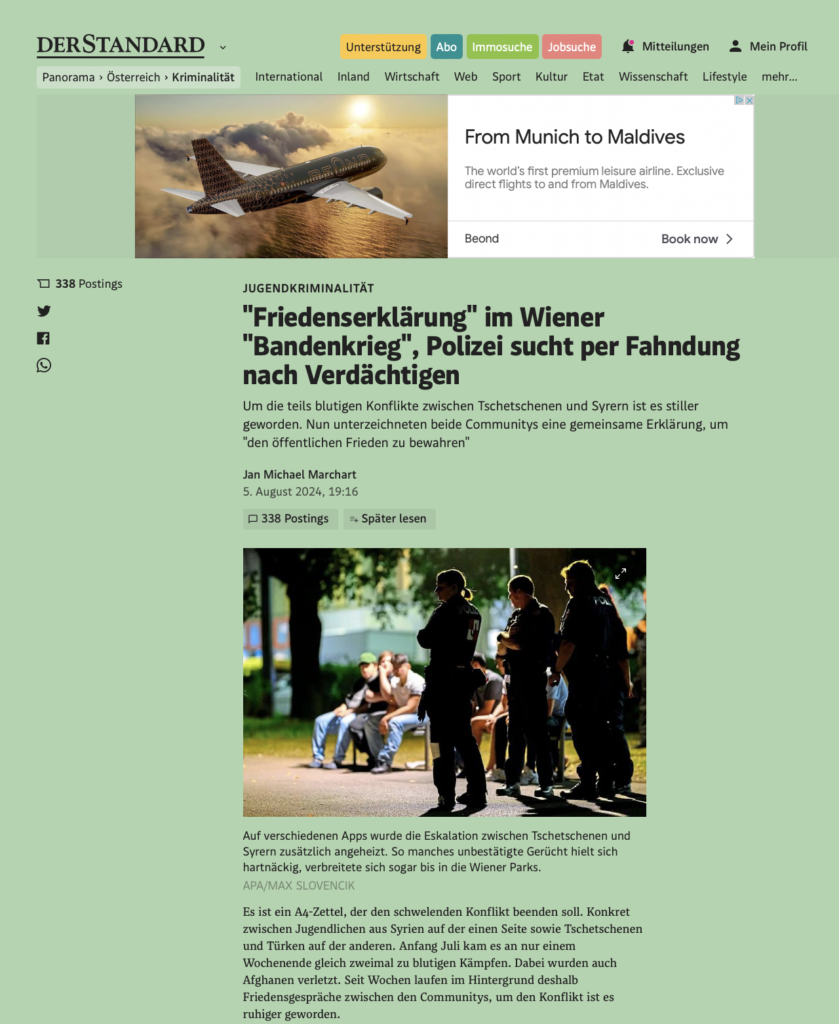 „Die teilweise blutigen Auseinandersetzungen zwischen Tschetschenen und Syrern haben sich beruhigt“, berichtet der Standard. Beide Volksgruppen haben nun eine gemeinsame Erklärung zur „Wahrung des sozialen Friedens“ unterzeichnet. Die im Artikel „Friedenserklärung im Wiener ‚Bandenkrieg‘, Polizeifahndung nach Verdächtigen“ in der Tageszeitung „Der Standard“ enthaltenen Informationen sind für uns sehr verstörend, beunruhigend und untergraben das Vertrauen in den Rechtsstaat. Auf solche Wiener „Taliban-Banden-Friedenserklärungen“ verzichten wir in einem Rechtsstaat.